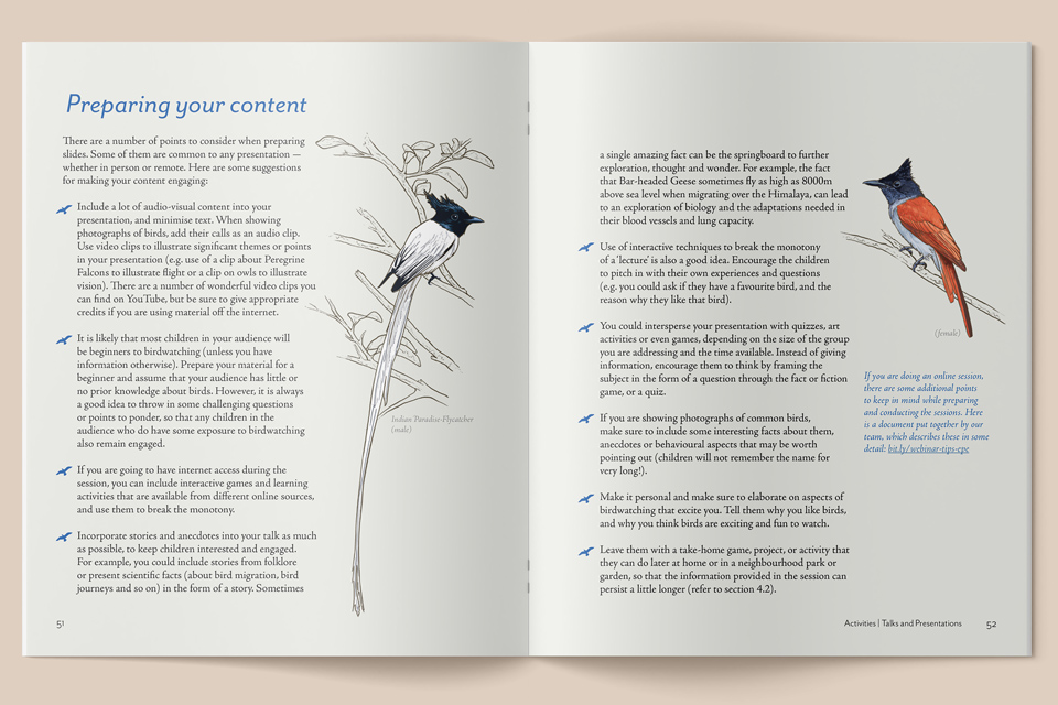 The idea behind this handbook is summed up in this quote by David Sobel – “If we want children to flourish, to become truly empowered, then we must allow them to love the earth before we ask them to save it.” We hope that the handbook will convince educators to not feel limited by their perceived lack of knowledge or understanding of the natural world, and take the plunge, along with their children, to explore, discover and appreciate the fascinating world of birds!