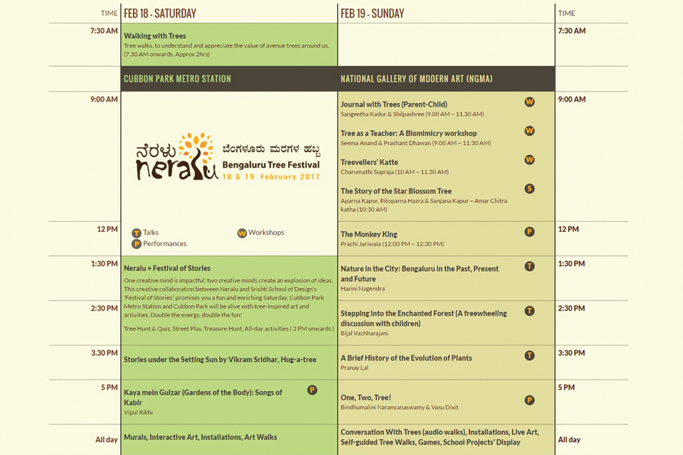 This year, Neralu’s events will reach out to more neighbourhoods of our lovely city. We kick off on Saturday, 18th February, on a festive note, at one of Bengaluru’s newer landmarks, the Cubbon Park Metro Station, and the corner of Cubbon Park abutting it. On Sunday, 19th February, National Gallery of Modern Art (NGMA) plays host, with talks, workshops, performances and all-day activities lined up. Neralu’s tree walks come right to your neighbourhood! Workshops and Walks require prior registration, and you can register here: www.neralu.in/register