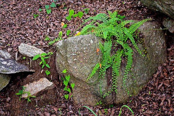 Ferns are masters of survival and grow wherever there is moisture, moderately rich soil with lots of organic matter, and shade or full sun. As it turns out, the only places in urban forests that fulfil these requirements are crevices and nooks in rocky ground and beneath boulders; this is the perfect substrate because over the years, eroding rock, decaying plant matter, and nutrients and minerals trapped inside create the rich, dark soil that ferns need.