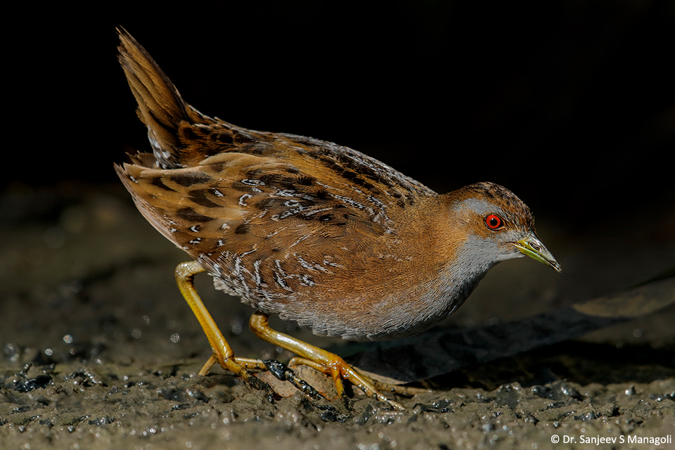 It is a widespread winter visitor in the northern parts of India but is uncommon in Karnataka. The Spotted Crake is appreciably bigger than other crakes, almost similar in size to a starling. These birds tend to skulk in thick cover and walk with their body close to the ground while flicking their tail. They swim with a jerky action like that of the moorhen. If surprised in the open, they run for cover or jump up and flutter away with legs dangling.
