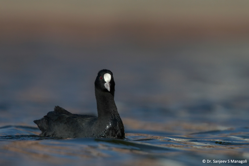 Known also as the Common Coot, the bird can be seen swimming on open waters with its lobed toes. It can also be seen upending or grazing on grassy shore as it feeds. It patters noisily over the water before taking off. Coots can be very aggressive birds both towards their own kind and other birds, often indulging in noisy squabbles.