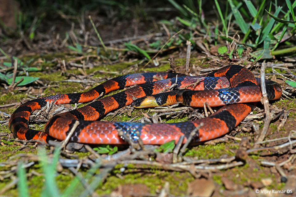 At first sight, I thought it was one of the colour morphs of the Common Krait and sent the pictures to my friend Sunil Sachi, who is knowledgeable about reptiles and amphibians. After a while, he let me know that it was one of the Western Ghats endemics, and a rare sight. It was the venomous Bibron’s Coral Snake (Calliophis bibroni).