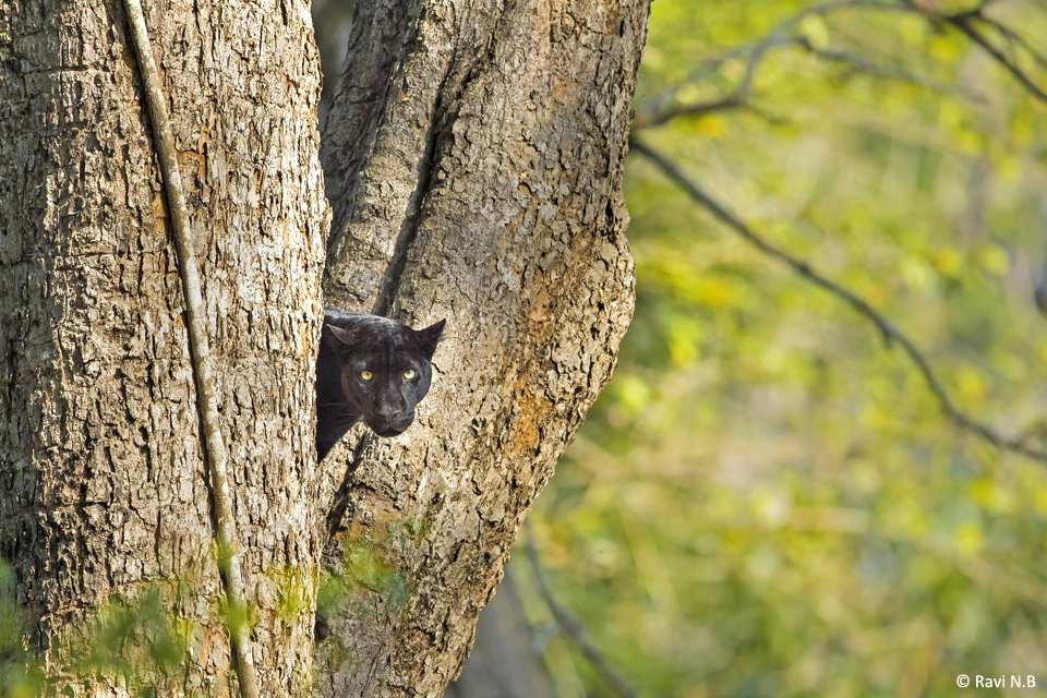 Being just a melanistic version of the leopard, one should expect them to climb trees too. I think its amazing to see them up on a tree. They weigh up to 60-70 kg and live up to 12-15 years in the wild. Normally, black leopards are found in rainforests and in the Western Ghats, but rarely found in dry-deciduous forests like Nagarahole, Mudumalai and Bandipur, though there have been sporadic records.