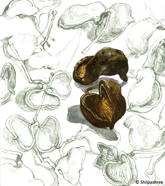 I had been collecting fallen seeds as souvenirs from around Bangalore. Slowly, seeds I found in places I travelled to made their way into my collection. Soon enough, I discovered the joy of painting seeds. Painting in nature helps to observe with a keen eye and I tend to see a lot more when I sketch or paint. The entire process helps me connect deeply to what I choose to paint, and it becomes a part of my memory with a deep sense of knowing.