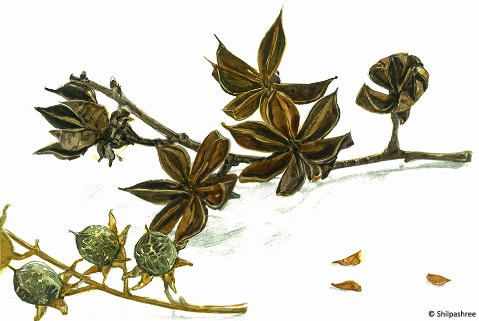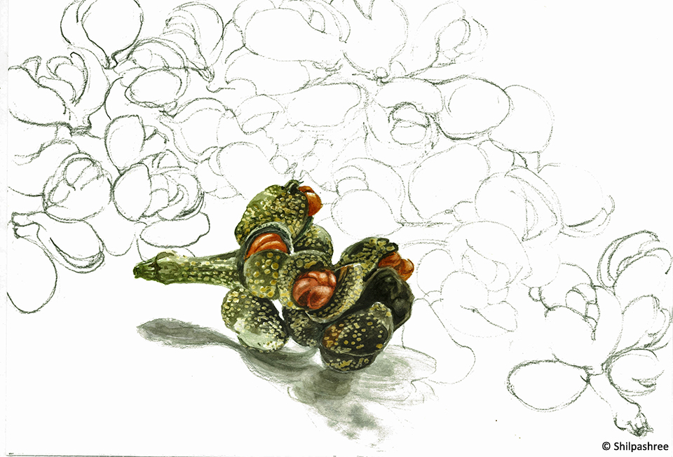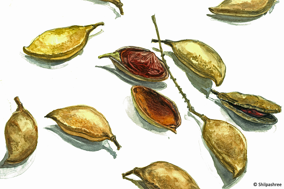 On day 100, when I looked back, I was amazed with the body of work I had built, along with the playful experiments with watercolour and the new insights I garnered about plants and trees. I used to have just enough time to start a painting and end it within four to five hours before it got dark because natural daylight is the best source for painting highlights and shadows. I didn’t have the time to make any preliminary sketches or doodles, so I had to decide the composition on the spot, while setting up the seeds on the table. On cloudy days I would get hazy shadows and subdued highlights and when the sunlight was bright, I would get clear shadows. Every day brought up a new seed and a new challenge and ended with an enriching experience. I am humbled by the kind of diversity of species around us, even though we live in a concrete city. Nature never ceases to inspire; all we need to do is to look around and take notice.
