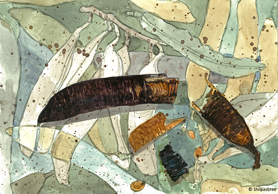 A common avenue tree, the Shisham is popular for the use of its timber. The light green fruits glow like fluorescent LED lights while the rest of the tree is covered in dark green, highlighting the colour of the fruits. I tend to see everything in terms of colours and what added to the beauty of the tree was the presence of light pale browns and rusty and fresh burnt siennas. The different stages of the fresh fruits and dried up seedpods set the stage for painting that day.