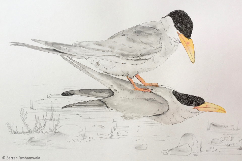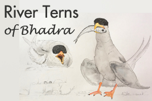 On a hot, sunny day in May, bathed in sweat, I watch the shimmering waters of the Bhadra reservoir. It’s hard to miss the cacophony of a thousand birds on a few distant islets that the receding water-level has exposed. Ever so often, a cloud of birds suddenly appears, as they take off in unison, circle around, and disappear back to the islet. While the distance is too far to observe details, the birds are unmistakably River Terns (Sterna aurantia), the very same birds that have lent their name to this beautiful lodge from where I stand observing this sight.
