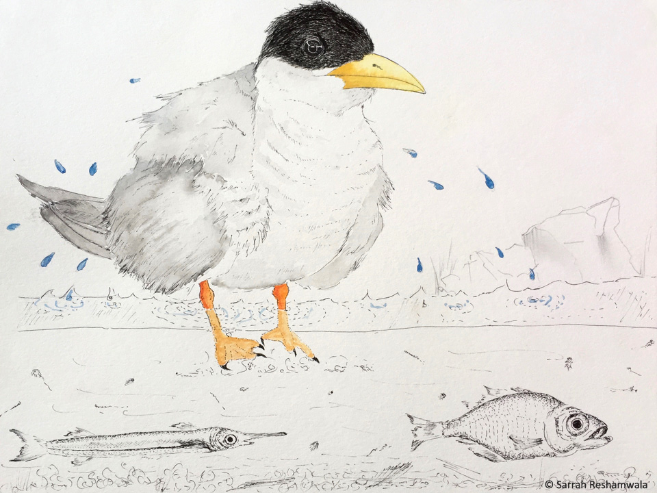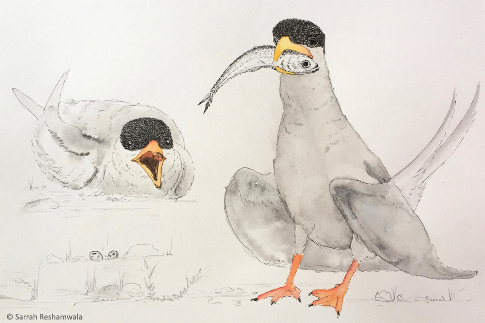 As my eyes move up, above the water-line, I observe a sandy area where a large number of birds appear to be sitting. Some of these are female terns incubating their eggs. The eggs themselves are hard to observe, as they blend perfectly with the tiny pebbles and rocks which line these sandy beaches. This is also the staging area for the terns’ courtship and mating rituals.
