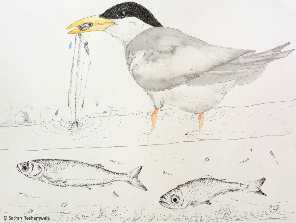 Male terns from nesting pairs fly far and wide to all corners of the reservoir, in search of the small, silvery fish that peak in the waters at this time of the year. This fish, known as ‘Bilchi’ (Barilus sp.) by the local fishermen, typically grows up to 4-5 inches. In the blink of an eye, a tern dives down, more often than not coming up with a prized possession in its beak. Off it hurries, darting away from other terns that have not had any luck and might fancy a steal.