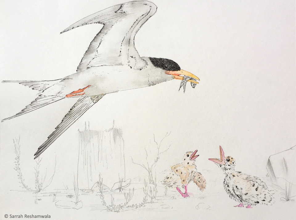 Further up on the islet, a few fast-growing grasses and plants have set their roots well. These plants too are making the most of their ephemeral existence before being engulfed by the monsoon and rising waters. Cleome viscosa (Yellow Spider-flower) is in bloom, lending a yellow hue to the ground. These plants protect the young hatchlings from predators and the blazing sun. It is still early in the season, and the majority of the eggs are yet to hatch. It takes me a while to notice the first chick, as it plays hide-and-seek behind these plants. But once I notice one, I notice a few. All of them are innocently curious about their surroundings, and with their beaks wide open, eagerly await their parents’ return with their meals.