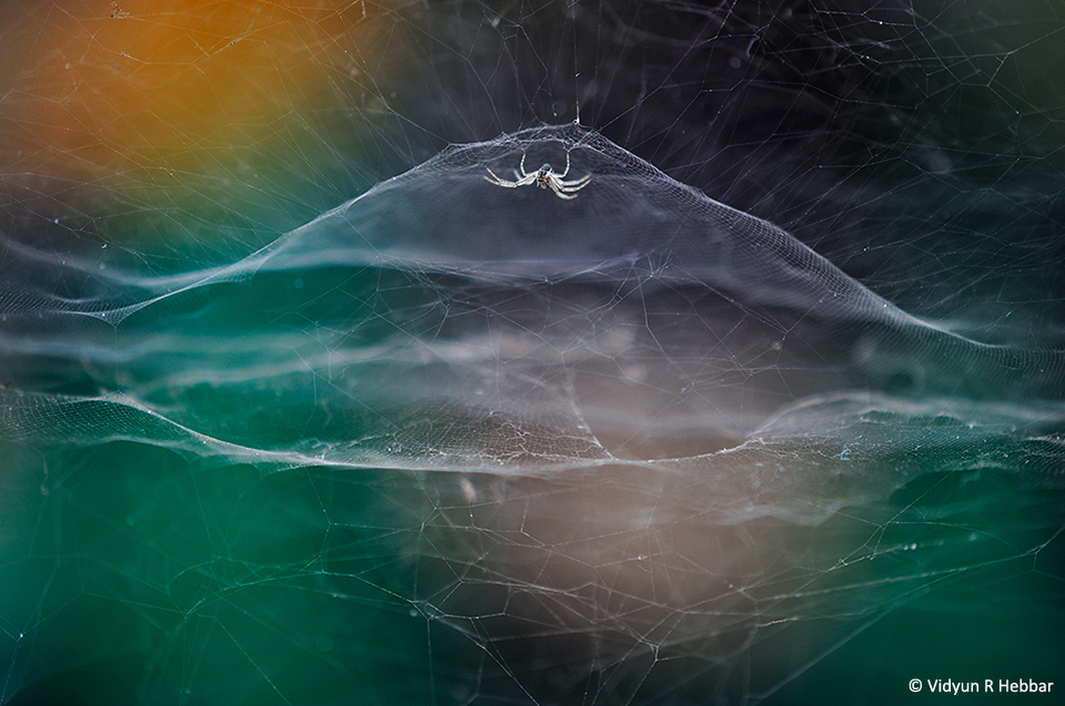 I shot this image at a theme park that houses upcycled, old car parts and old cars, in Bangalore. Here, alphabets of script of the Kannada language have been created using old car parts and they have been placed adjacent to a busy road. I was trying to capture the tent spider with moving vehicles in the background. It was quite challenging to focus on the spider because the web shook every time a vehicle moved in the background. After clicking hundreds of images, I managed to get some in good focus!