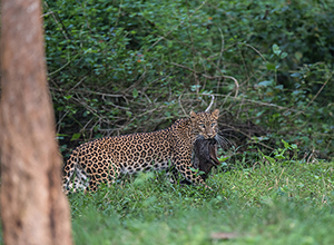 One of them in the jeep whispered, “leopard, leopard!” My heart began to pound the moment I saw the leopard, and the kill in its mouth. We assumed it was a langur kill and did not pay attention to its meal, but focused on photographing the leopard itself. This female leopard was very quick and kept an eye on us as she made a few leaps to cross over to the other side before disappearing into the woods.