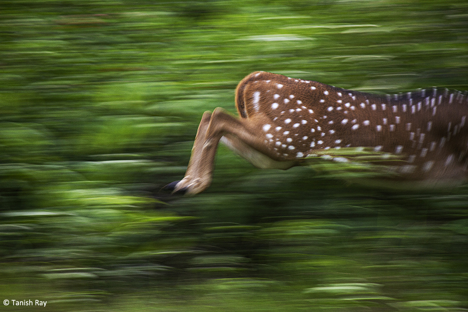 I was too close to the scene to photograph even a full deer. So I decided to capture whatever was left of a deer (in my frame), and with a 1/30 shutter speed while hand-holding the camera, I focused on its back while it jumped and lunged forward. I tried to follow the movement of the deer with my camera. And I came up with this frame which I do like a lot because it is action-packed and tells a story.
