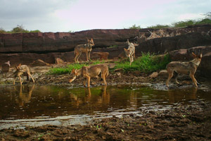 The staff of Jhamkhandi range was keenly tracking a pack of wolves; incidentally, Jhamkhandi Ravikumar (ACF, Social Forestry), who is keenly interested in birds and fauna, recorded the first sightings of this pack. The wolves’ pack was in excess of 14 individuals, along with young puppies. The staff of Jhamkhandi range set up a camera trap at the water-hole which the pack used to frequent, and finally pulled off a photograph which says more than a thousand words about the resurgence of wolves in North Karnataka.