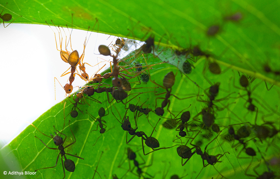 Weaver Ants make their nests by stitching leaves together. They usually make many nests in a single tree. Sometimes, they make many nests across many trees. Queen Ants govern these colonies. Weaver Ants are also abundant in the forests of Western Ghats. The species is important to us farmers as they eat small insects that can be harmful to crops.