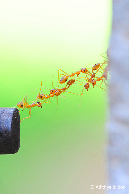 My knowledge and scientific understanding of these ants are close to zero. If you don’t pay attention to them, they may seem like regular red coloured ants, but if you look them carefully, you will notice that they are amazing engineers. Their discipline and ability to team up and work together are extraordinary.