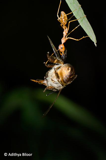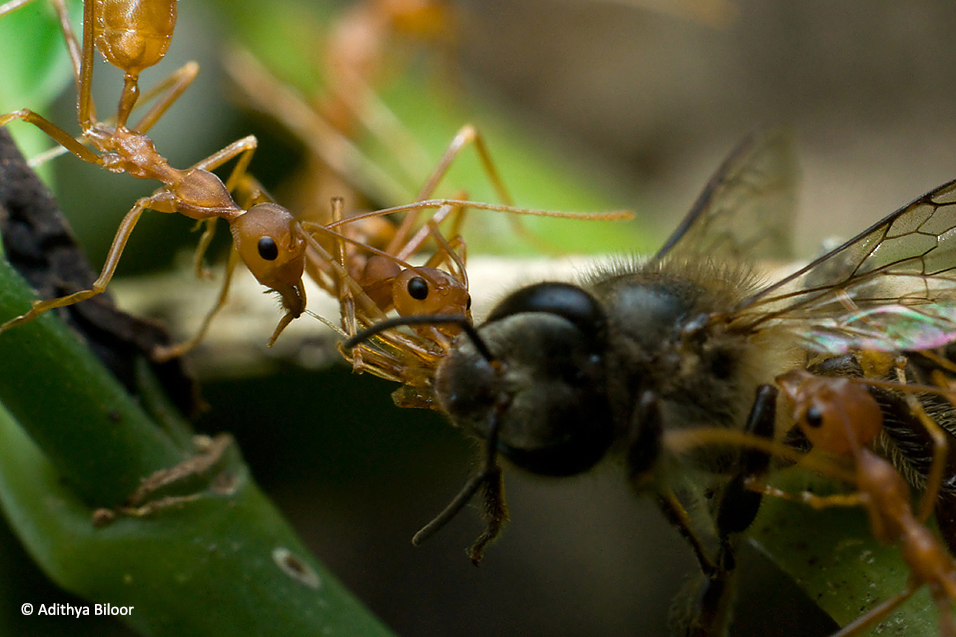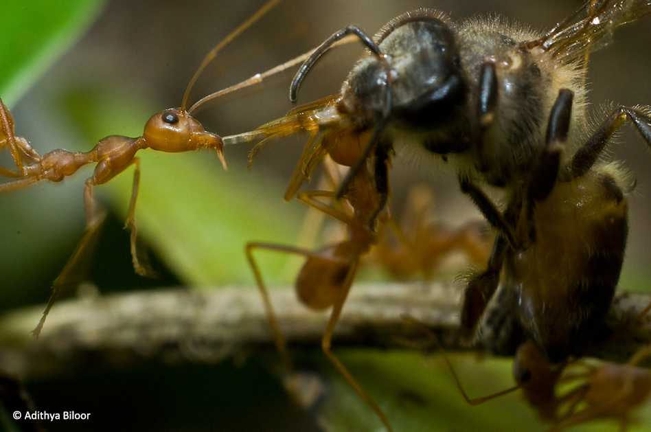 In one instance, an ant was easily holding on to a bee that was about to fall, while hanging mid air!