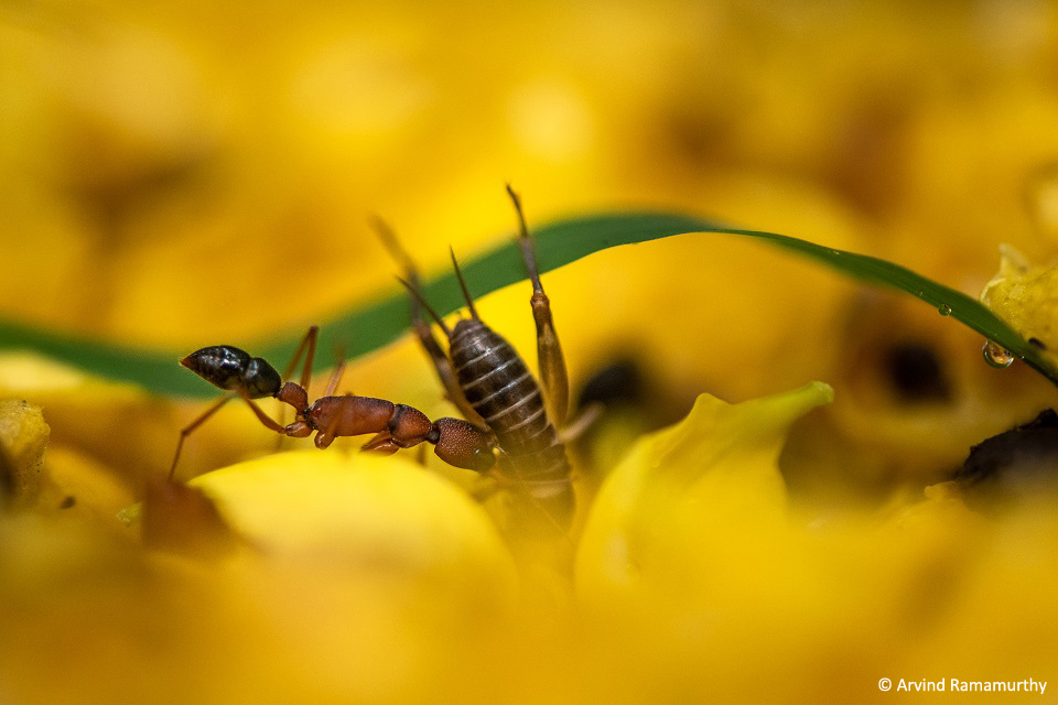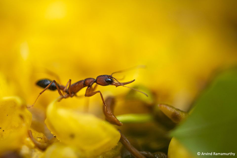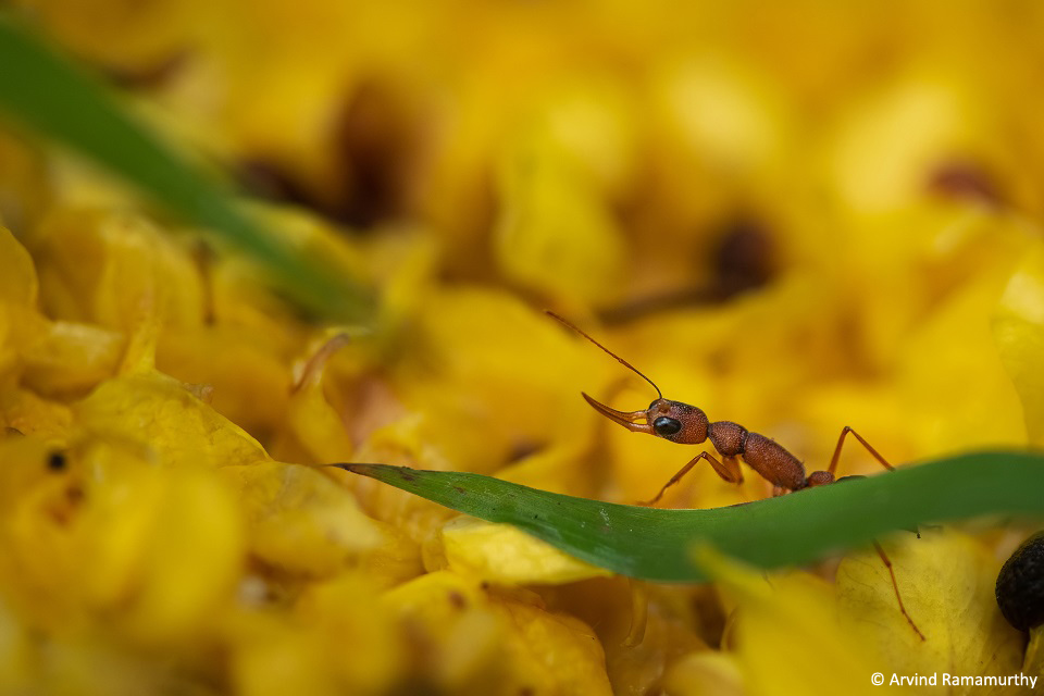 Shivanand, a naturalist at the camp, asked me if I was interested in photographing an ant colony that had nested right next to the main reception area of the property. I jumped at the opportunity and headed out to the site. The species in question here was Harpegnathos saltator, commonly known as the Jumping Ant.