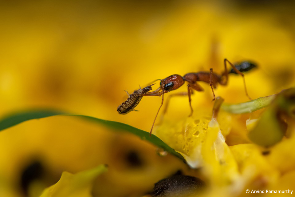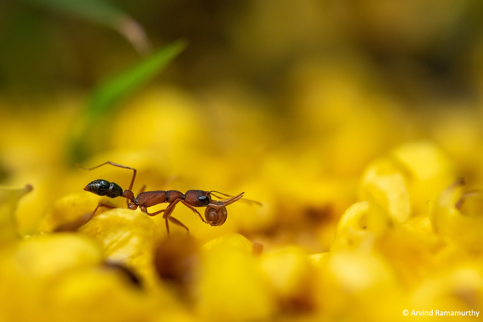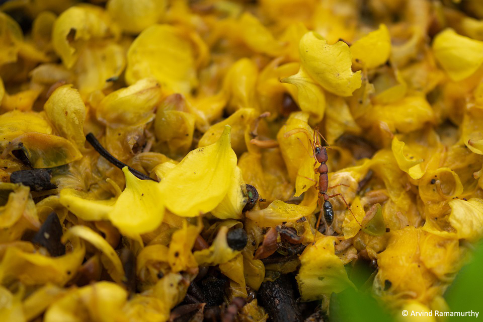 At first, the nest appeared to be a very bright yellow patch on the ground. On closer look, to my disbelief, I saw that the ants had in fact decorated the nest with yellow flowers. They had used the flower petals of the Cassia fistula tree. The ants had picked up petals from the forest floor and dropped them around the entry to their nest.