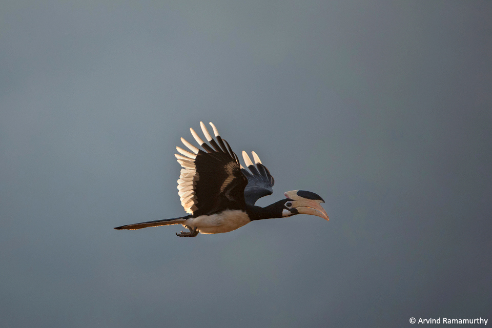 Hornbills set off every morning and feed throughout the day (here, a female hornbill is seen in flight). Malabar Pied Hornbills are omnivorous, and although their diet is primarily figs, they consume other small birds, insects, etc. They visit a wide variety of fruiting trees and disperse their seeds far and wide. It is for this reason that they are called ‘farmers of the forest’.