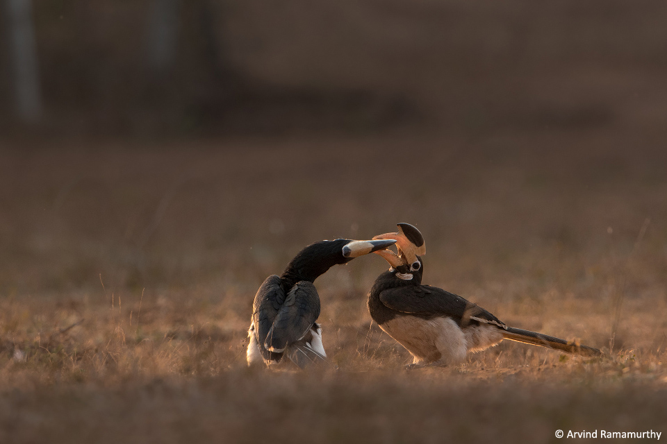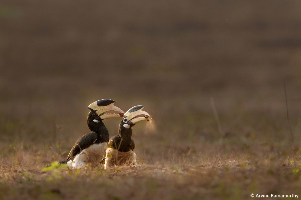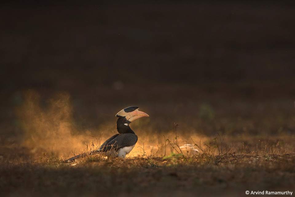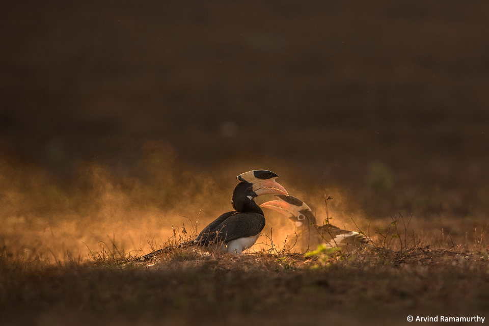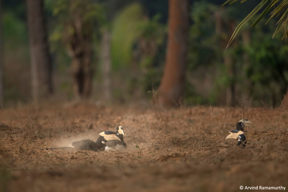 Like a grand finale to the day, every evening, before they get back to their roost, hornbills bathe in fine dust in open agricultural fields.