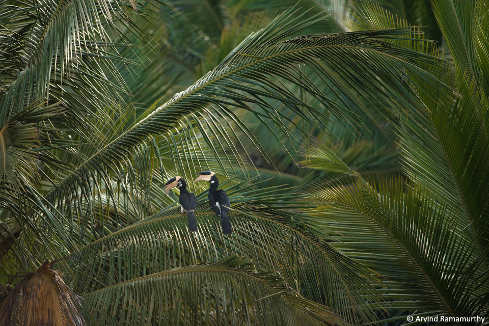 A hornbill pair observes human activity from a coconut grove. These birds are extremely sensitive to changes in their environment and spook at the slightest disturbance, so photographing them was a long waiting game. The birds would first land on the coconut trees and watch the area for about half an hour. Only once confident that it was safe would they come down for the dust bath.