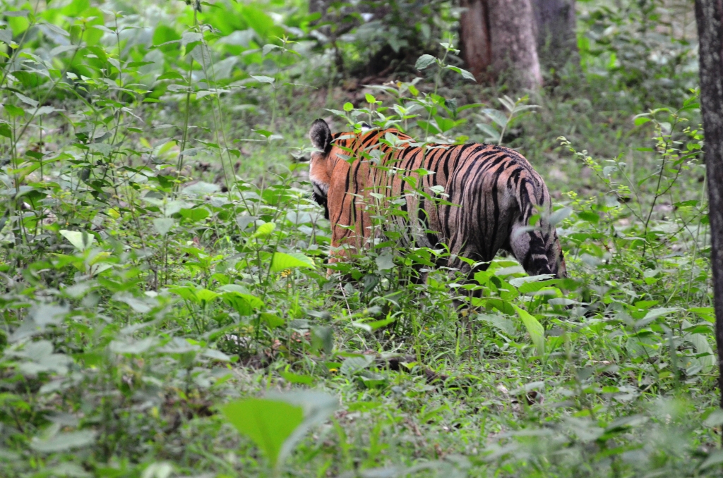 Mammals: Tigress standing beside the road for a while, after sometime it crossed the road, then Scent marked a tree and went into the bushes. Sambar, Stripe-necked Mongoose and Malabar Giant Squirrel.